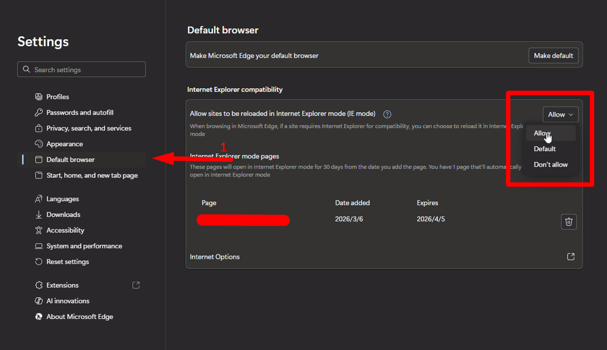 d. Click the “Default Browser” tab, navigate to the “Allow sites to be reloaded in Internet Explorer (IE Mode)” dropdown, and select “Allow”.
