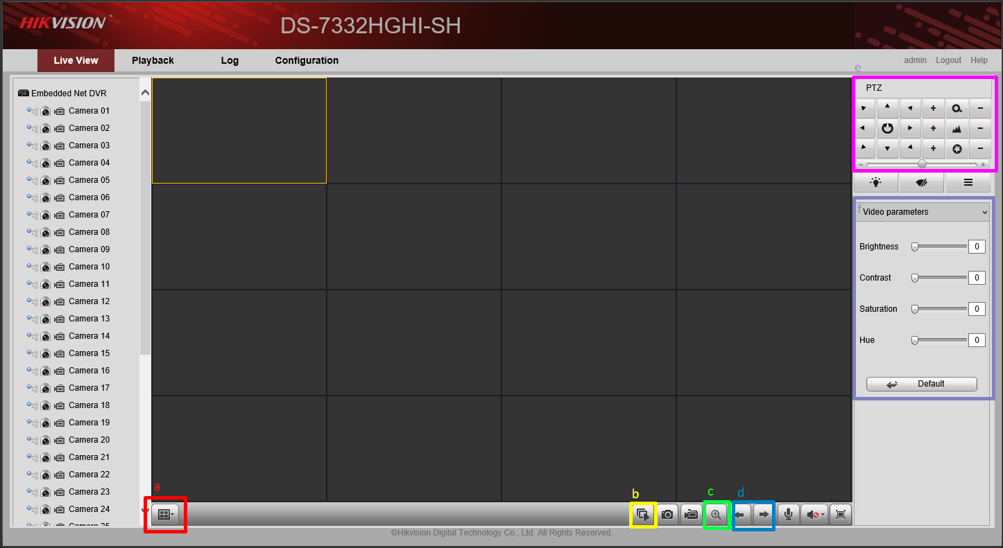 You can see a live view of the cameras on the Live View Page. Please refer to the screenshot and legends below to use some of the important Live View functions.