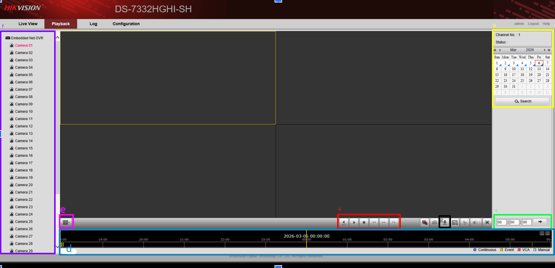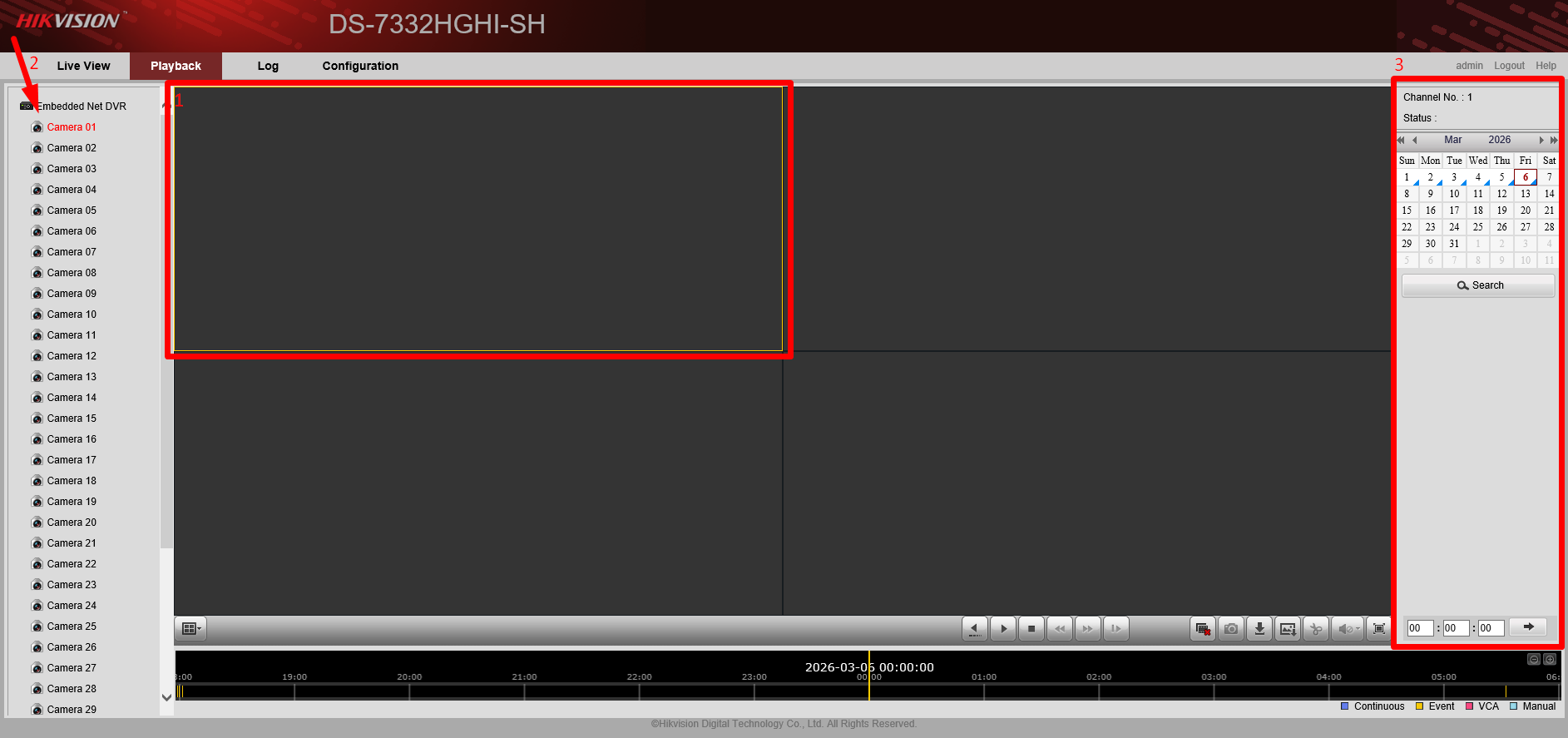 You view the cameras’ recordings on the Playback Page. Please refer to the screenshot and legends below to use some of the important Playback functions.
