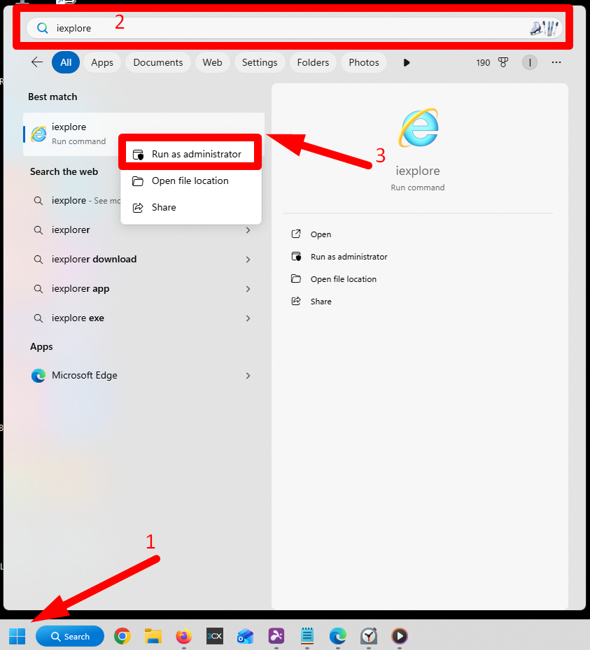 b. Right Click and select “Run as administrator”. This will run a command that opens the Internet Explorer browser.