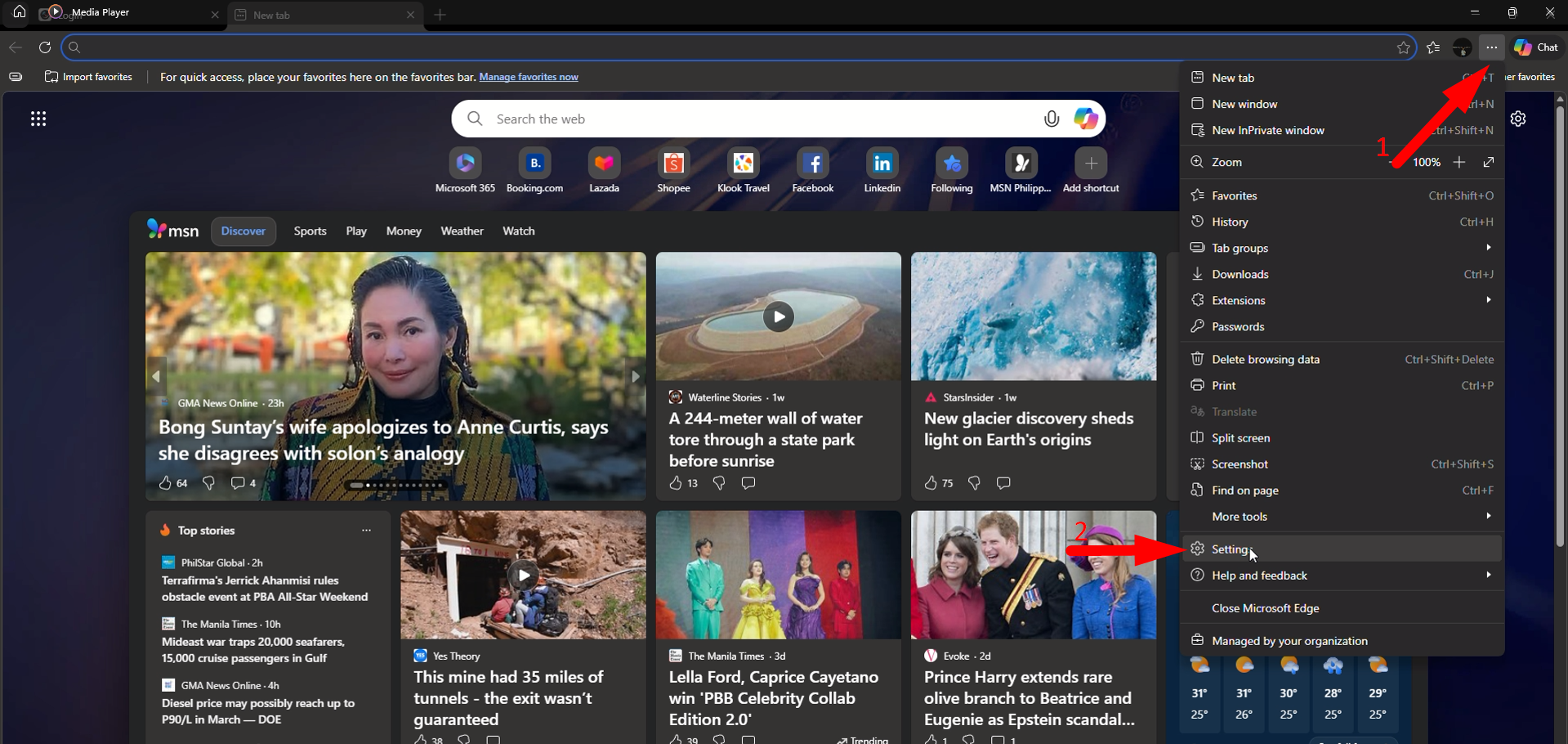 c. Since Microsoft has discontinued IE and if your computer is newer/updated, it will likely open Microsoft Edge instead. Navigate to the Settings icon at the top right of Microsoft Edge and open settings.