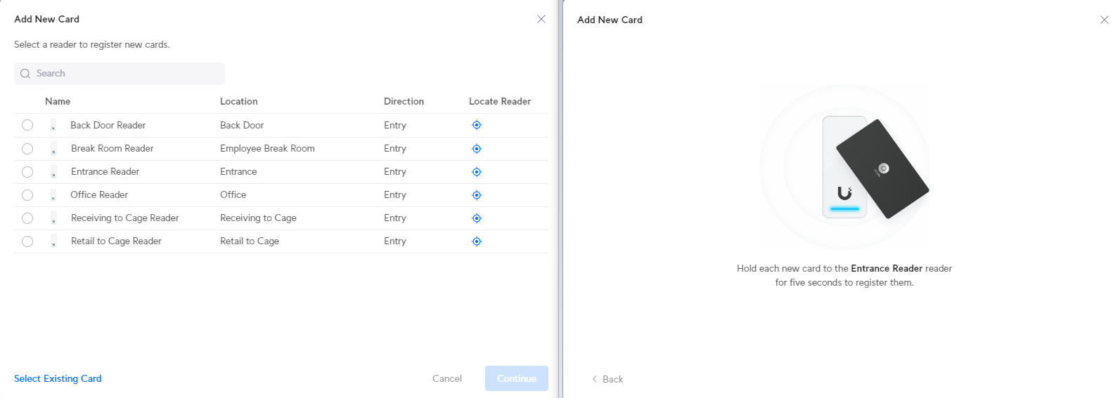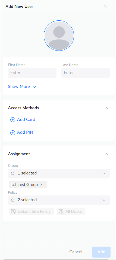 2. Enter the first and last name, Access Methods and Assignments, . To add a card, click Add Card, choose the reader to register the card with, and then click Continue. Next, swipe the card on the reader that you need to register. To add a PIN, click Add PIN and then you can randomly generate or Enter a custom PIN. Once done, click on Add below.